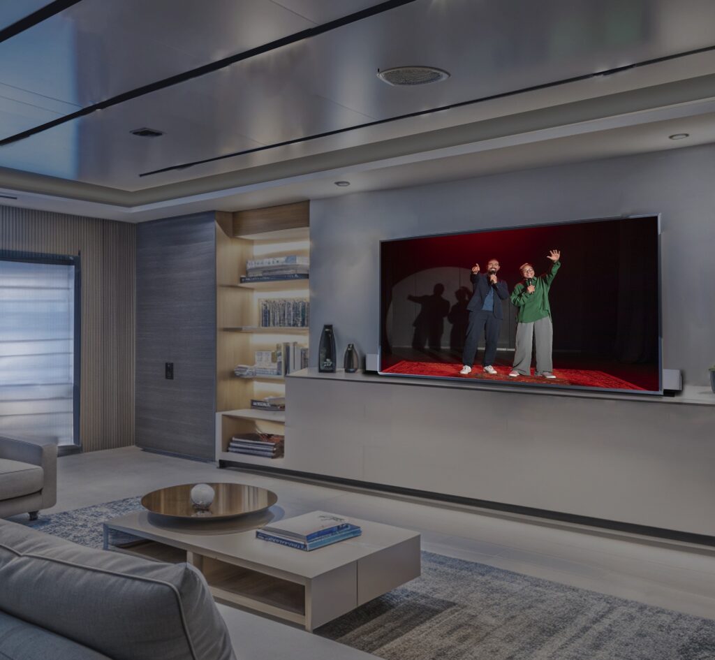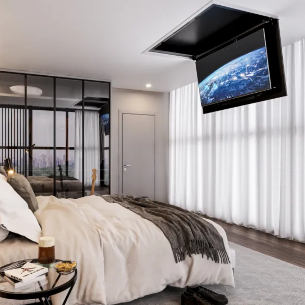 O mais leve do mercado. Acabamento interno em preto, fazendo com que a concentração fique apenas na TV. Fácil instalação, tem suporte com engate rápido e parafusos já acoplados no mecanismo. Basta fixar o suporte no teto, encaixar os pios e apertar os parafusos, que são apenas quatro. Motor dentro do mecanismo e silencioso. Flap com apenas 117 mm de altura entre laje e forro para instalação, sem as bases de teto. Acabamento inferior em polímero e alumínio com escova de vedação para que não apareça nenhuma abertura.